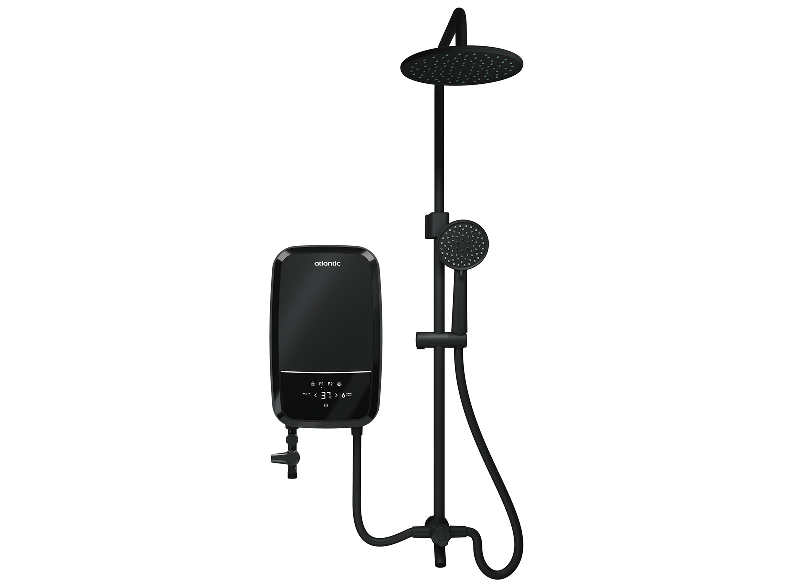 Shower in Style and Power: Experience the Tempo Turbo water heater powering a luxurious all-black rain shower for an unmatched experience.